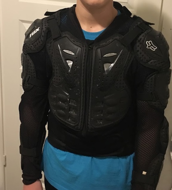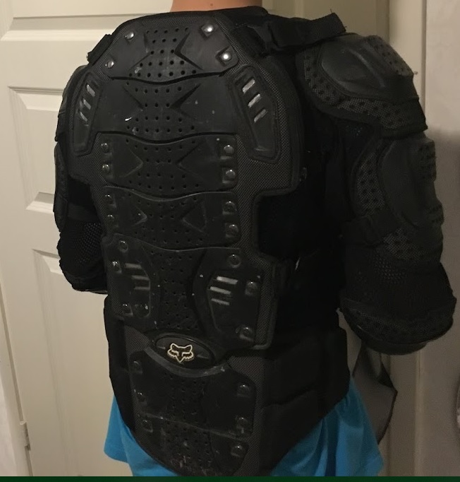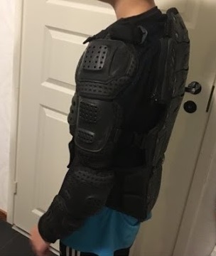 Selkä- ja rintapanssari, polvi- ja kyynärsuojat, jotka vähentävät iskujen aiheuttamia vammoja.
